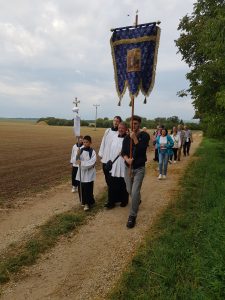 Putovali sme v malej skupinke s našim duchovným otcom, v sprievode miništrantov, veriacich, pod ochranou Sedembolestnej P. Márie a sv. Cyrila a Metoda, ktorých obrazy zdobia našu novú procesiovú zástavu. V predvečer nášho putovania bola pri svätej omši zástava požehnaná.